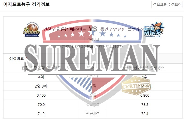 11월17일 WKBL 인천 신한은행 에스버드 용인 삼성생명 블루밍스 분석을 시작하기에 앞서 저희 슈어맨은 항상 회원분들께 더 많은 혜택을 제공해드리고자 노력하고 있습니다. 다양한 경기들의 스포츠분석글을 제공해드리고있으니 많은 참고 바랍니다. 오늘 하루도 건승하시길 기원하겠습니다.