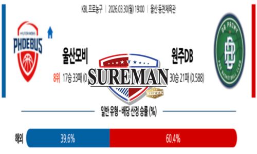 이번 경기는 리바운드와 외곽 효율, 그리고 클러치 집중력에서 승부가 갈릴 가능성이 높다. 울산 모비스는 공격 효율 저하와 리바운드 열세가 이어지며 흐름이 좋지 않은 반면, 원주 DB는 득점 밸런스와 경기 운영 완성도에서 앞선 모습이다. 최근 흐름과 전력 균형을 고려하면 원주 DB가 경기 주도권을 잡을 가능성이 높다.
