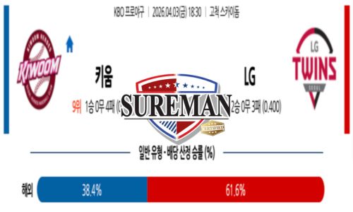 양 팀 모두 타격 흐름이 좋지 않지만, 선발 안정감에서는 알칸타라 쪽이 우위에 있다. LG는 치리노스의 컨디션이 불확실한 상황에서 초반 흐름을 내줄 가능성이 있다. 경기가 후반 접전으로 가더라도 현재 타격 상태로는 LG가 흐름을 뒤집기 쉽지 않다. 전반적인 구도를 보면 키움이 조금 더 유리한 경기다.