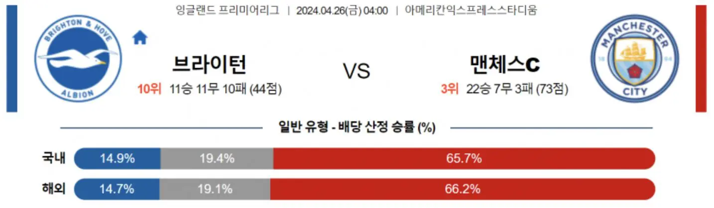 4월 26일 04:00 잉글랜 프리미어리그 브라이턴 앨비언 : 맨체스터 시티 스포츠 분석