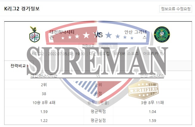 7월5일 K리그2 대전하나시티즌 안산그리너스 프로축구 분석