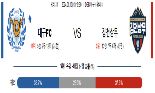 8월 16일 19:30 K리그1 대구FC vs 김천상무 스포츠픽