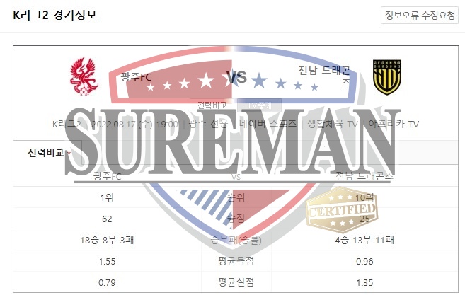 8월17일 K리그2 광주FC 전남드래곤즈 스포츠분석 슈어맨