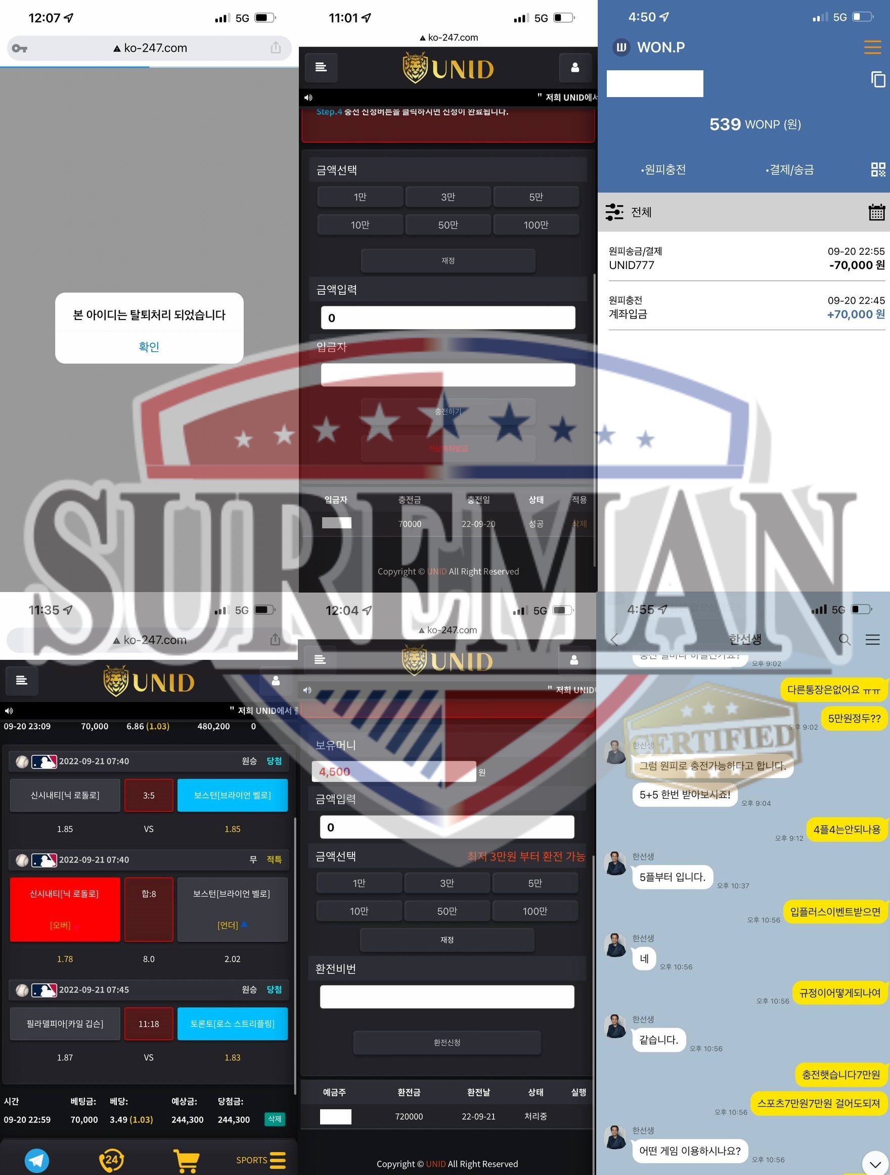 사설 토토 사이트 UNID 은 총판과 함께 높은 입금 플러스 이벤트를 활용해 회원들을 모집했고, 당첨이 되어 환전 신청하는 회원들을 가차 없이 탈퇴를 시키고 가족 방도 탈퇴 시키며 먹튀를 했습니다. 이렇게 악마같은 사이트는 항상 많은 핑계와 함께 환전을 지연시키거나 로그인을 차단하는 등 전형적인 먹튀수법을 사용하여 회원들의 소중한 자금을 갈취해가고 있습니다. 만약 이용하던 사설사이트 측에서 추가입금 유도할 시 절대 입금 하지 마시고 해당 내용을 슈어맨 고객센터로 문의하시어 먹튀 피해 방지를 하시길 바랍니다.